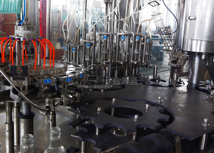 4.該機器生產線上包括了高質量的不銹鋼的清洗噴嘴,壓力灌裝閥,壓蓋機,熱蒸汽收縮套標機。消毒液加熱,熱水沖洗裝置。