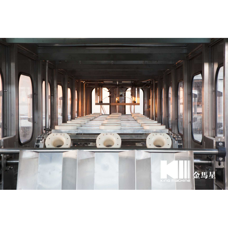 本灌裝生產(chǎn)線專用于3-5加侖桶裝水的灌裝,型號包括了QGF-100,QGF-240,QGF-300,QGF-450,QGF-600,QGF-900,QGF-1200。合消毒、沖洗、灌裝、壓蓋四為一體。沖洗機采用了多種洗液以及消毒液對瓶子進行清洗以及消毒,消毒液能夠循環(huán)使用。瓶蓋會在清洗和消毒后運至旋蓋機自動進行旋蓋。本產(chǎn)品功能齊全,涵蓋了清洗、消毒、灌裝、旋蓋、計數(shù)等功能,高度自動化,實為飲料生產(chǎn)廠家理想的優(yōu)選設備。